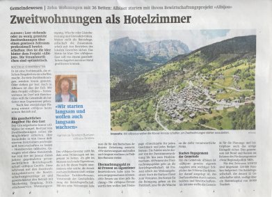 Mit der Gründung der Betriebsgesellschaft «ALBIJOU GmbH» sind am Samstag in Albinen die Voraussetzungen geschaffen worden, damit auf die kommende Sommersaison hin die professionelle Vermittlung, Vermietung und Bewirtschaftung von Zweitwohnungen anlaufen kann...